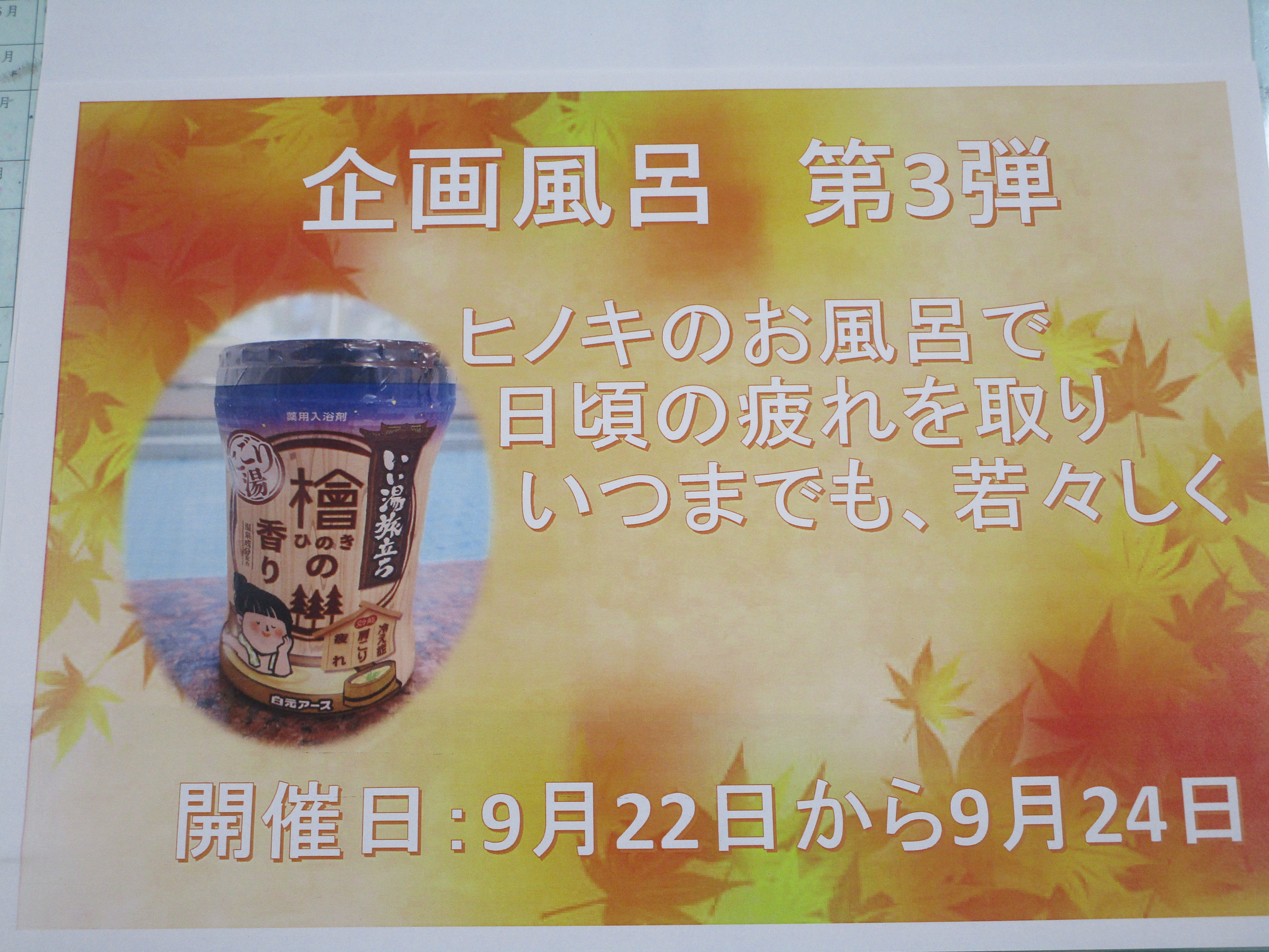 今月の企画風呂は、檜の香りをお楽しみいただきました。IMG_8506檜は、労をいたわれる香りで、職員も仕事しながら一緒に癒されていたようです( *´艸`)
