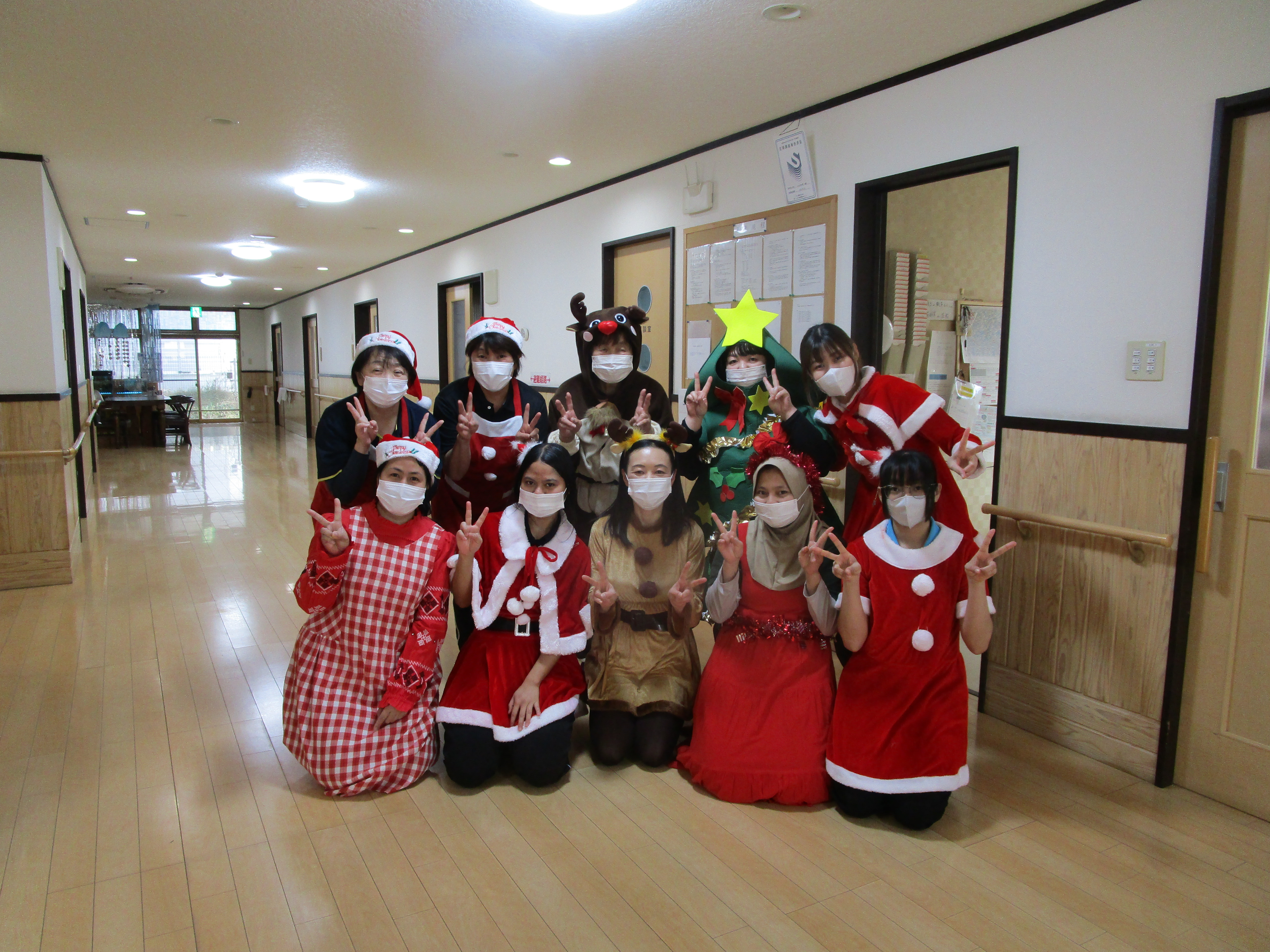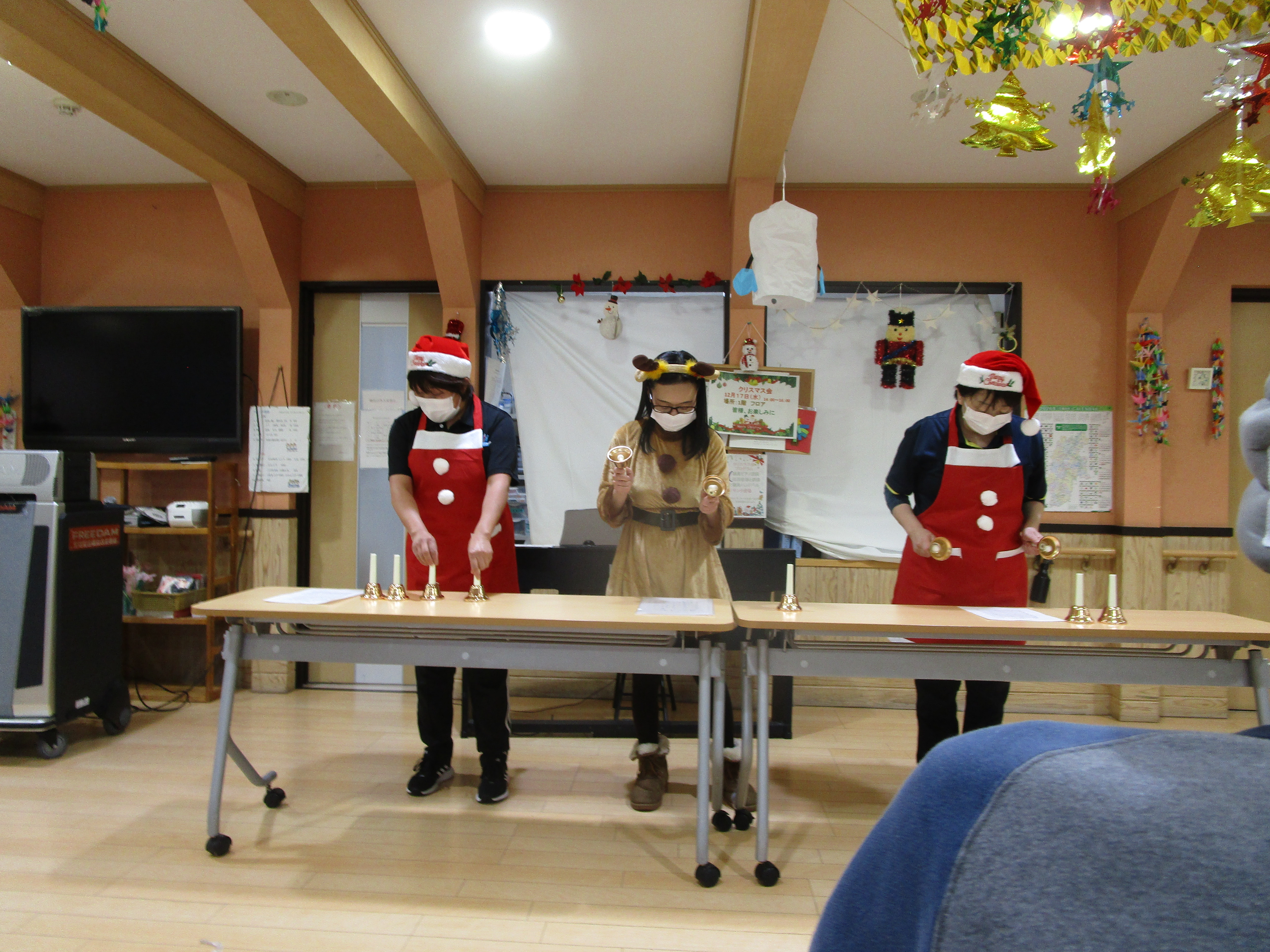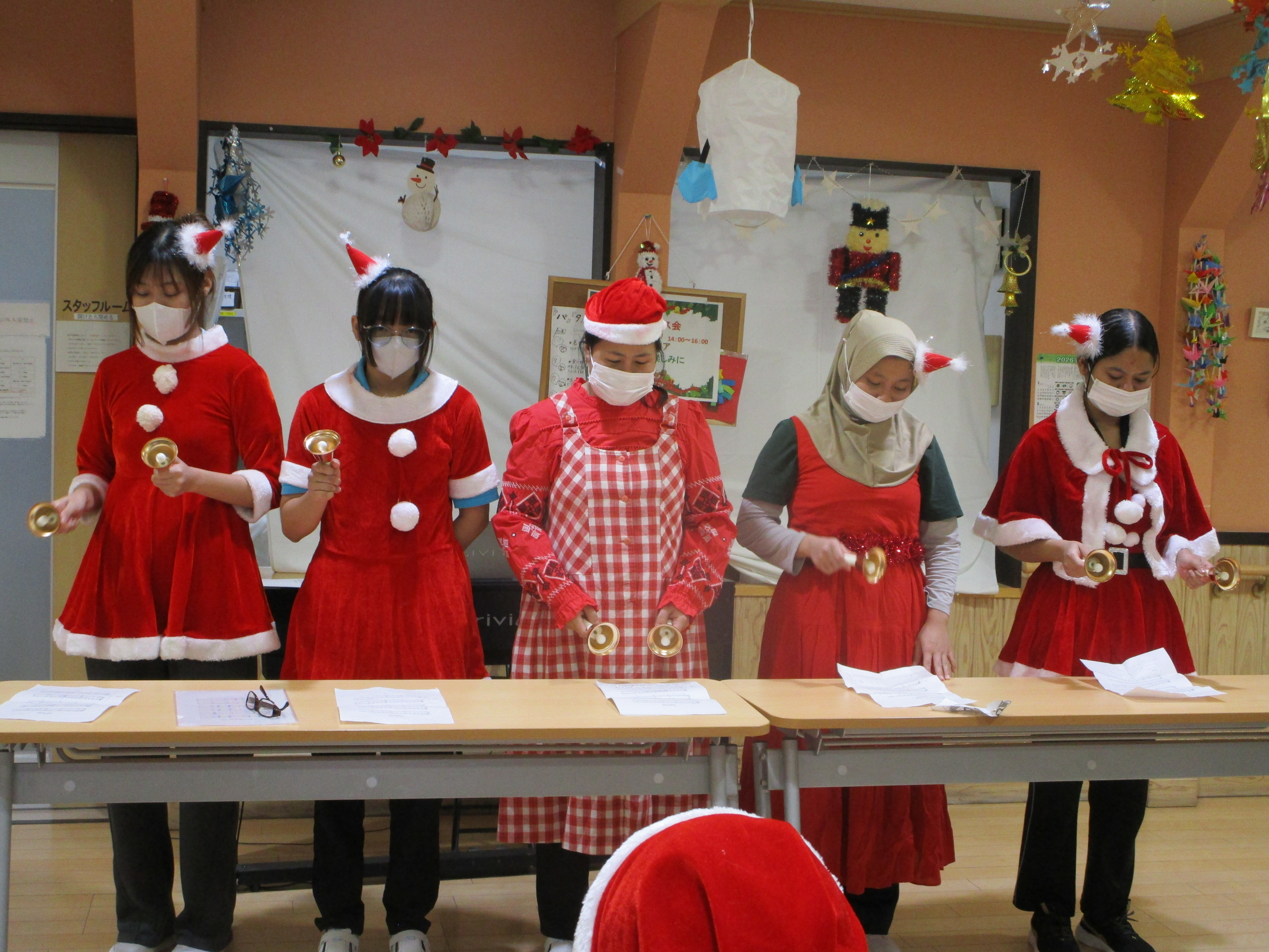 インドネシアとタイの職員が 「ジングルベル」を演奏しました。すれ違う勤務の中、ベルを持ち帰って自宅で練習を頑張ってくれました。感謝です。