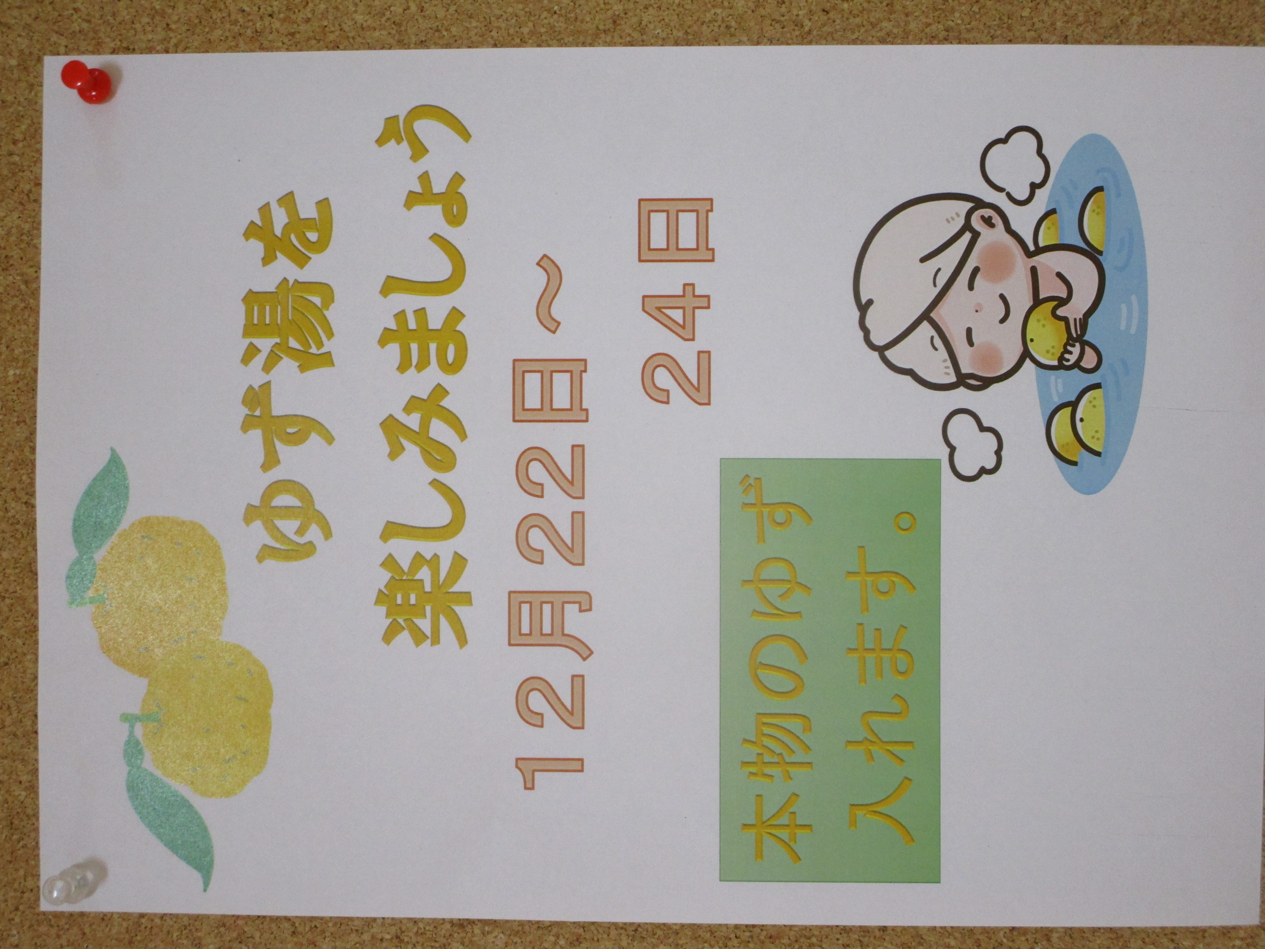 御影|2025年12月22日| 冬至 ~御影~ 12月22日の今日は、冬至です 八百屋さんで、ゆずを仕入れ、お風呂に浮かべます 。大風呂にもゆずがプカプカ。良い香りがしています。 個浴風呂にも、ゆずと入浴剤をミックスで。ゆず湯は、24日までお楽しみいただきます。 夕食には、冬至ならではのメニュー。ほうとう(味噌味)・カボチャのゴマ煮・ゆず入りなます・みかんです。温まるお夕飯ですね。日本文化大切にしたいです。冬至過ぎて、本格的な寒さを迎えます。