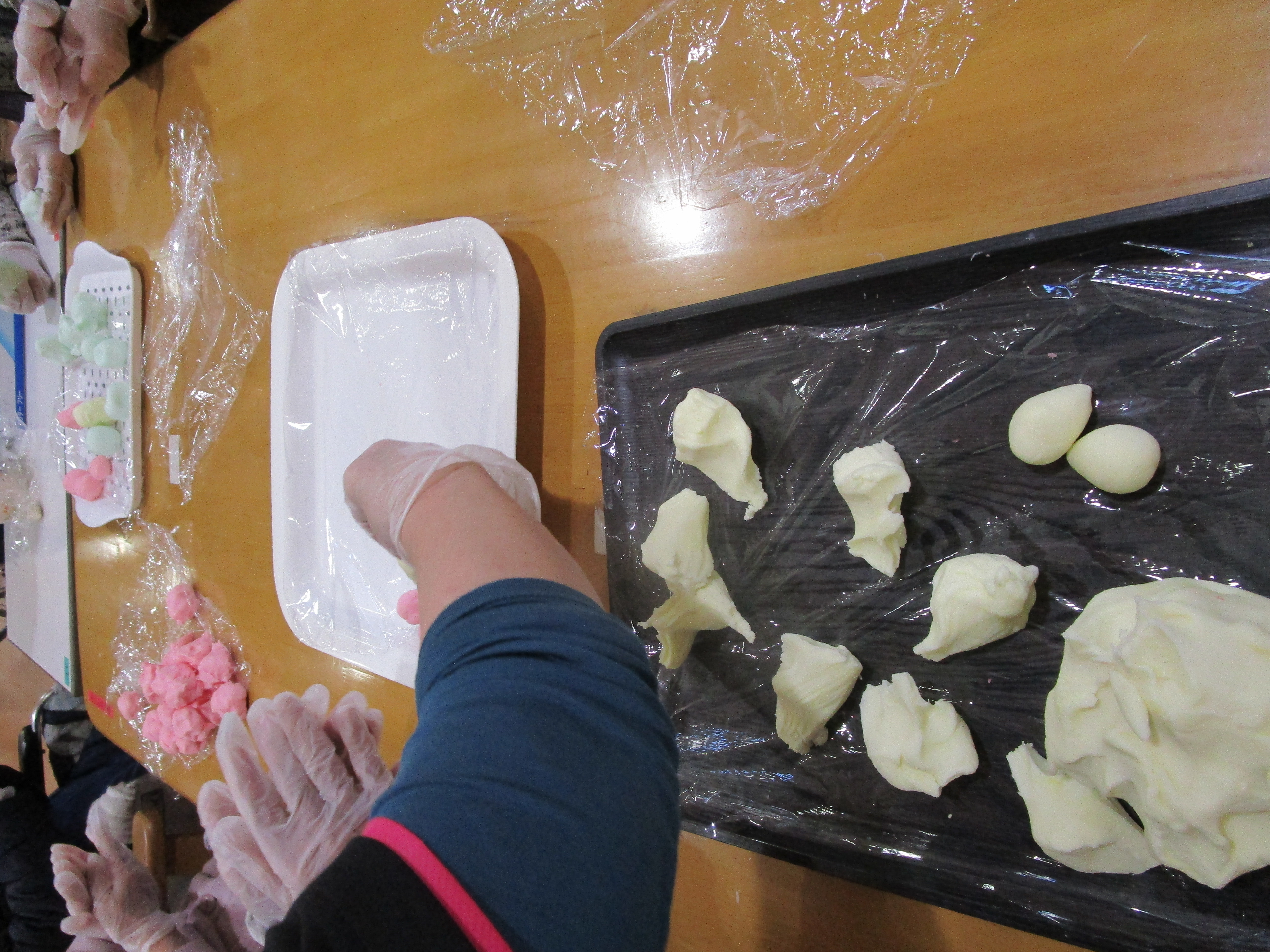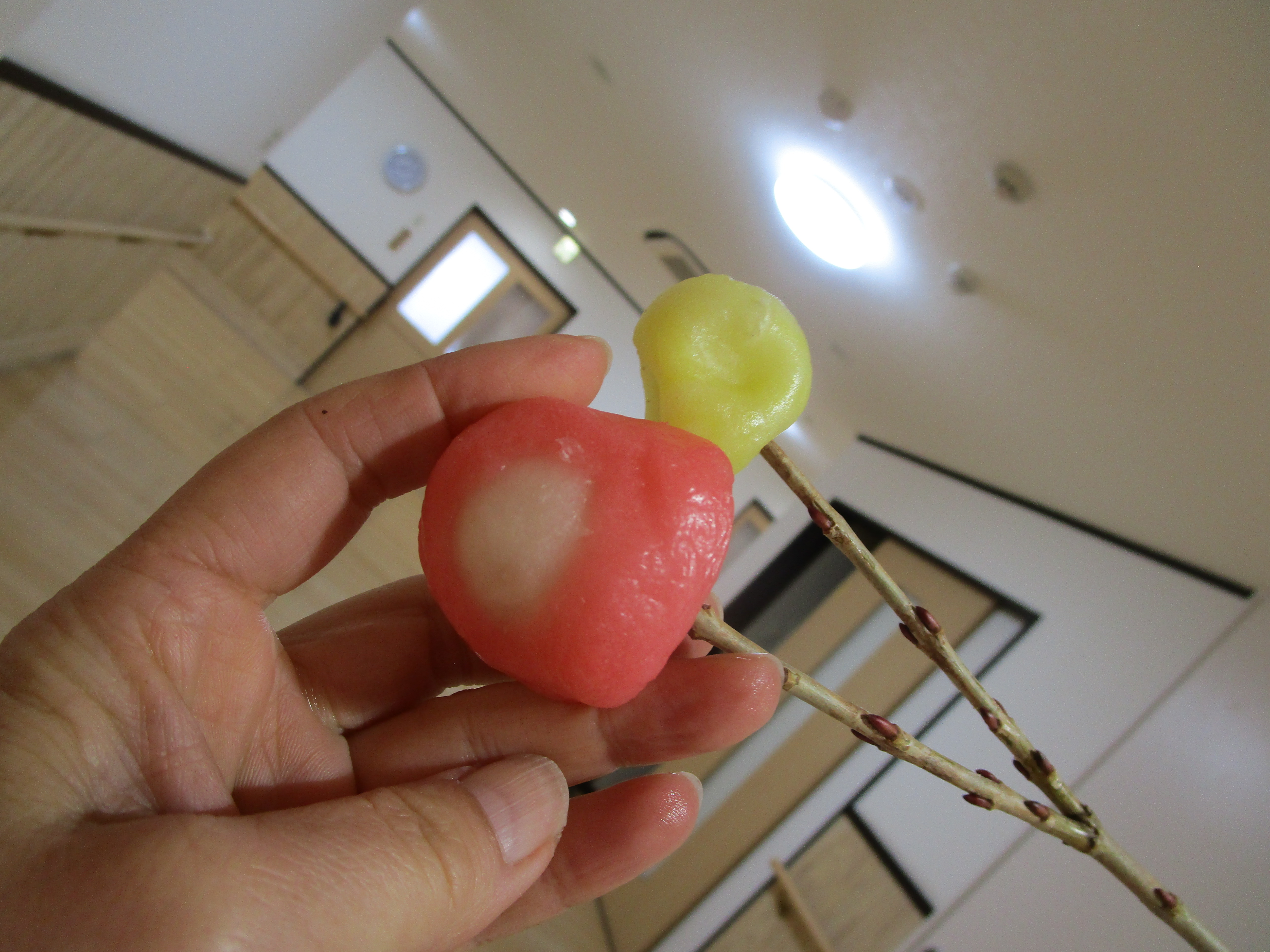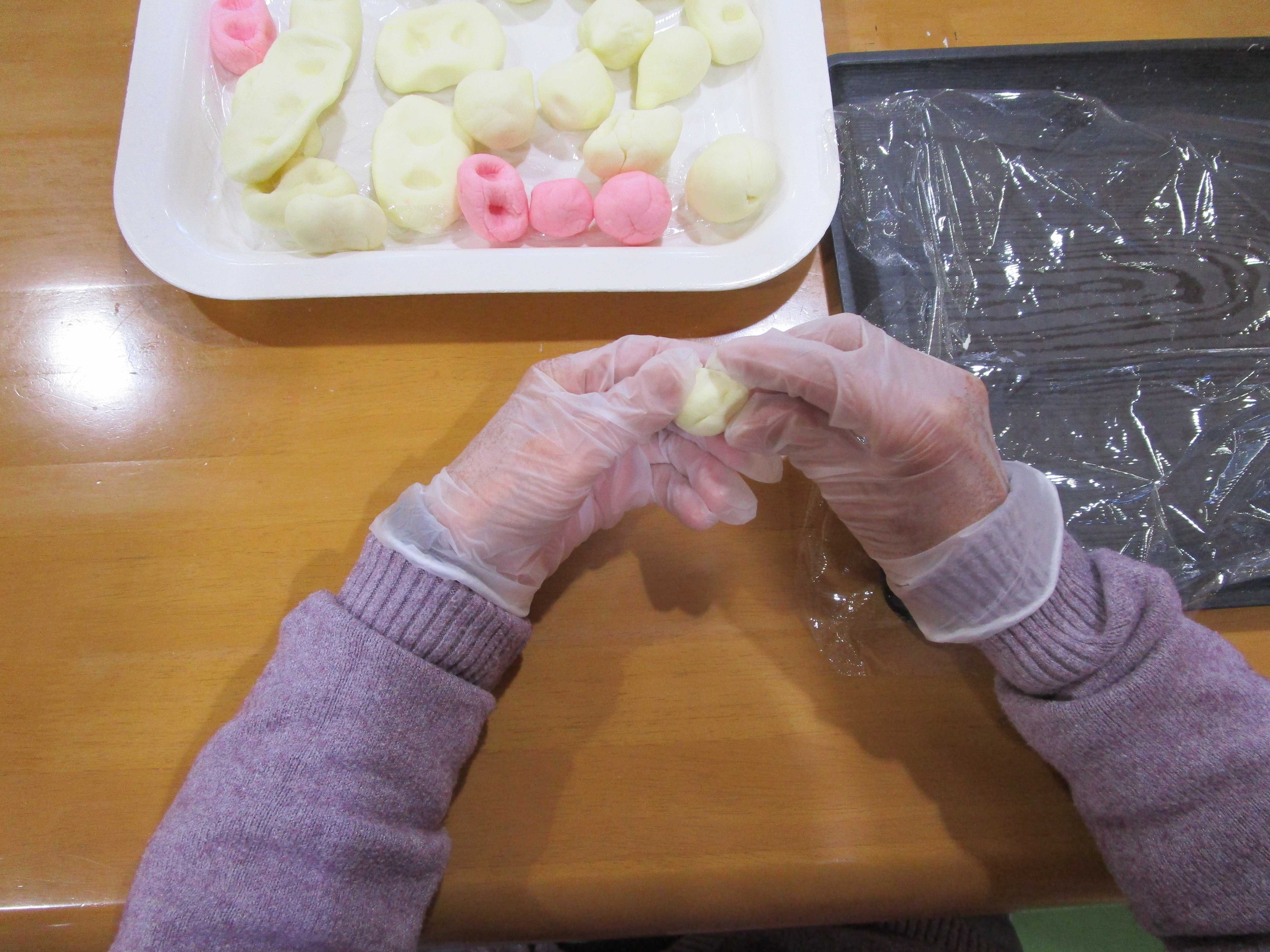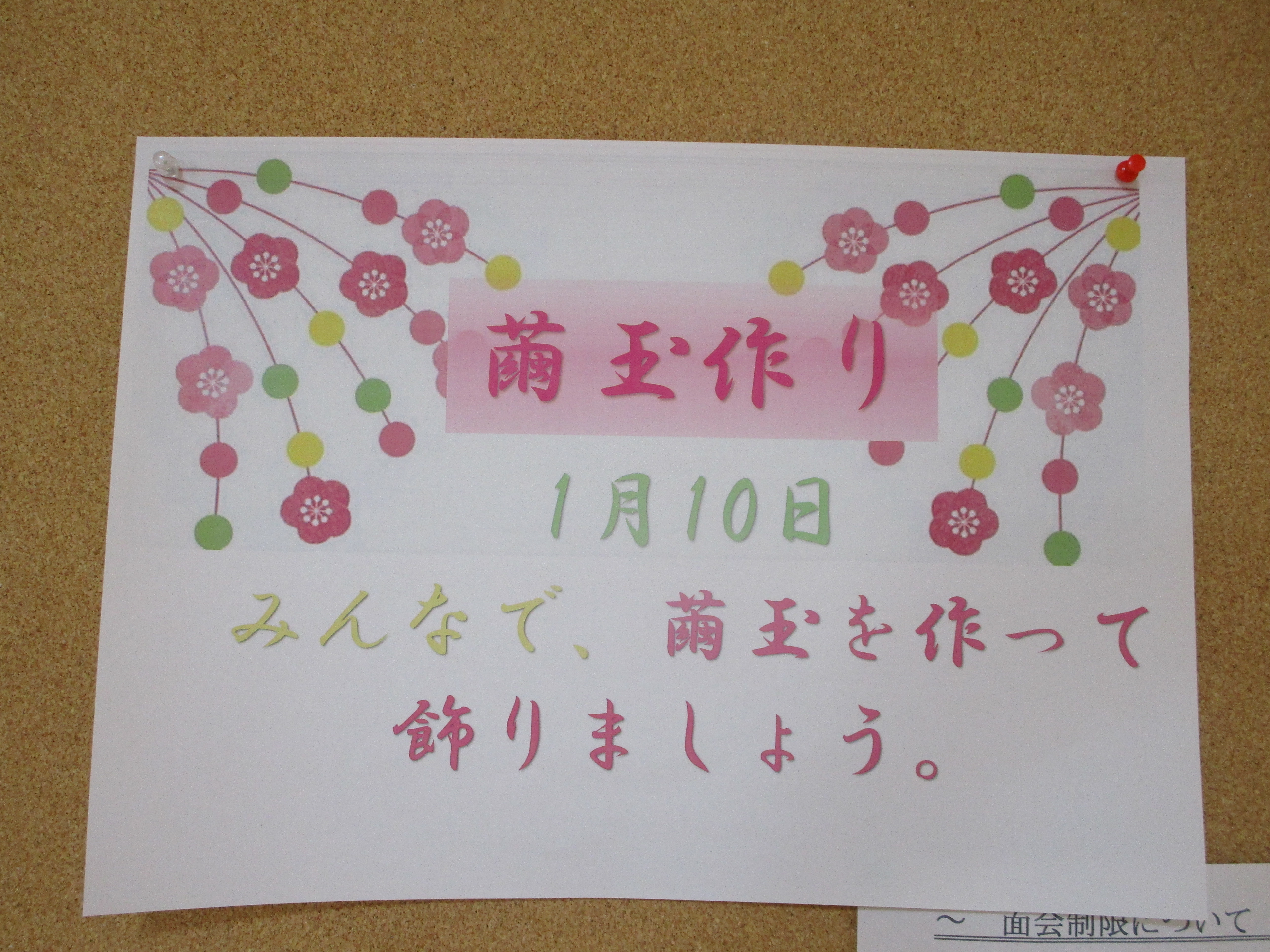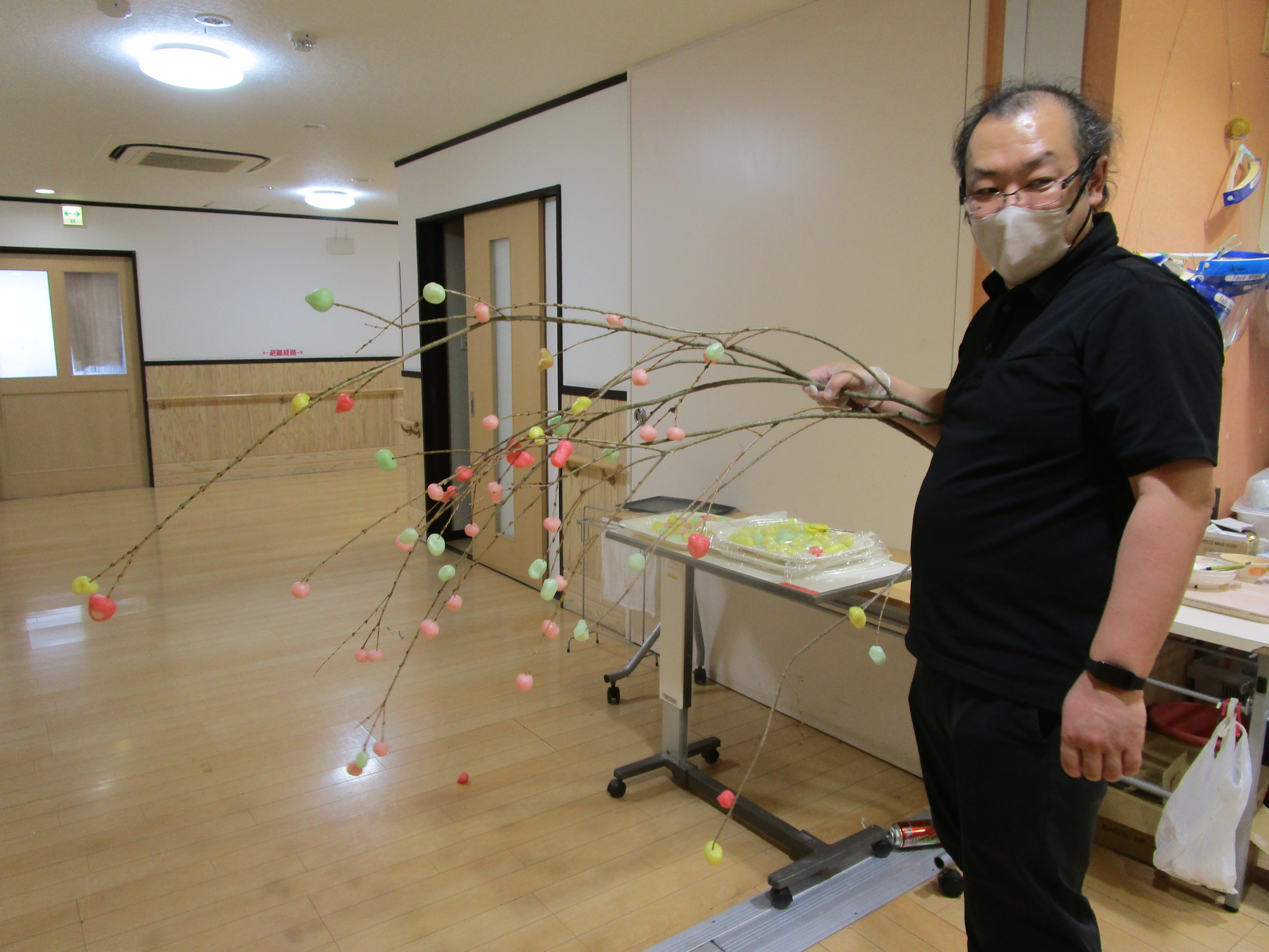 1月10日は、御入居者様達に教えて頂きながら、繭玉作りをしました。