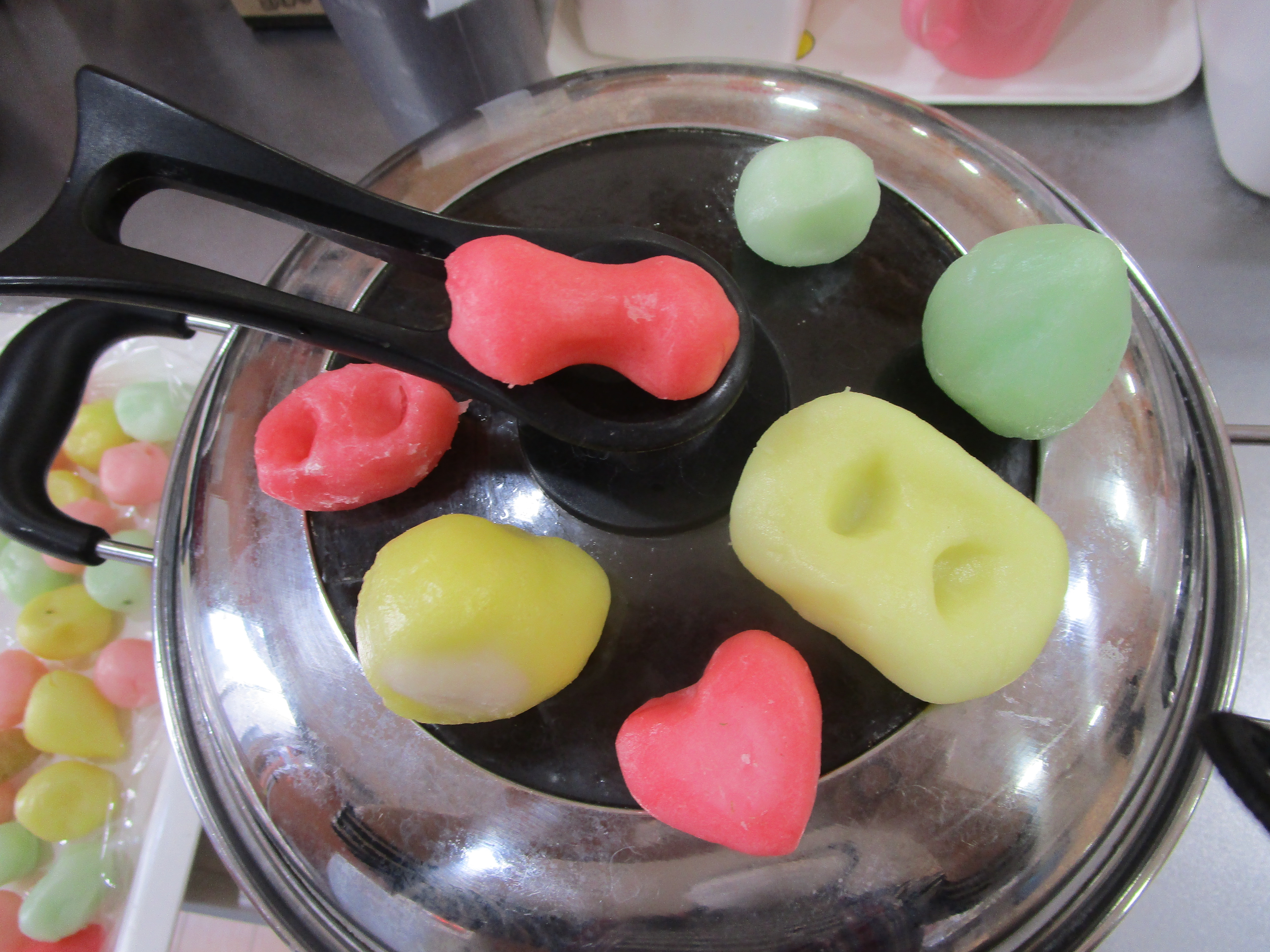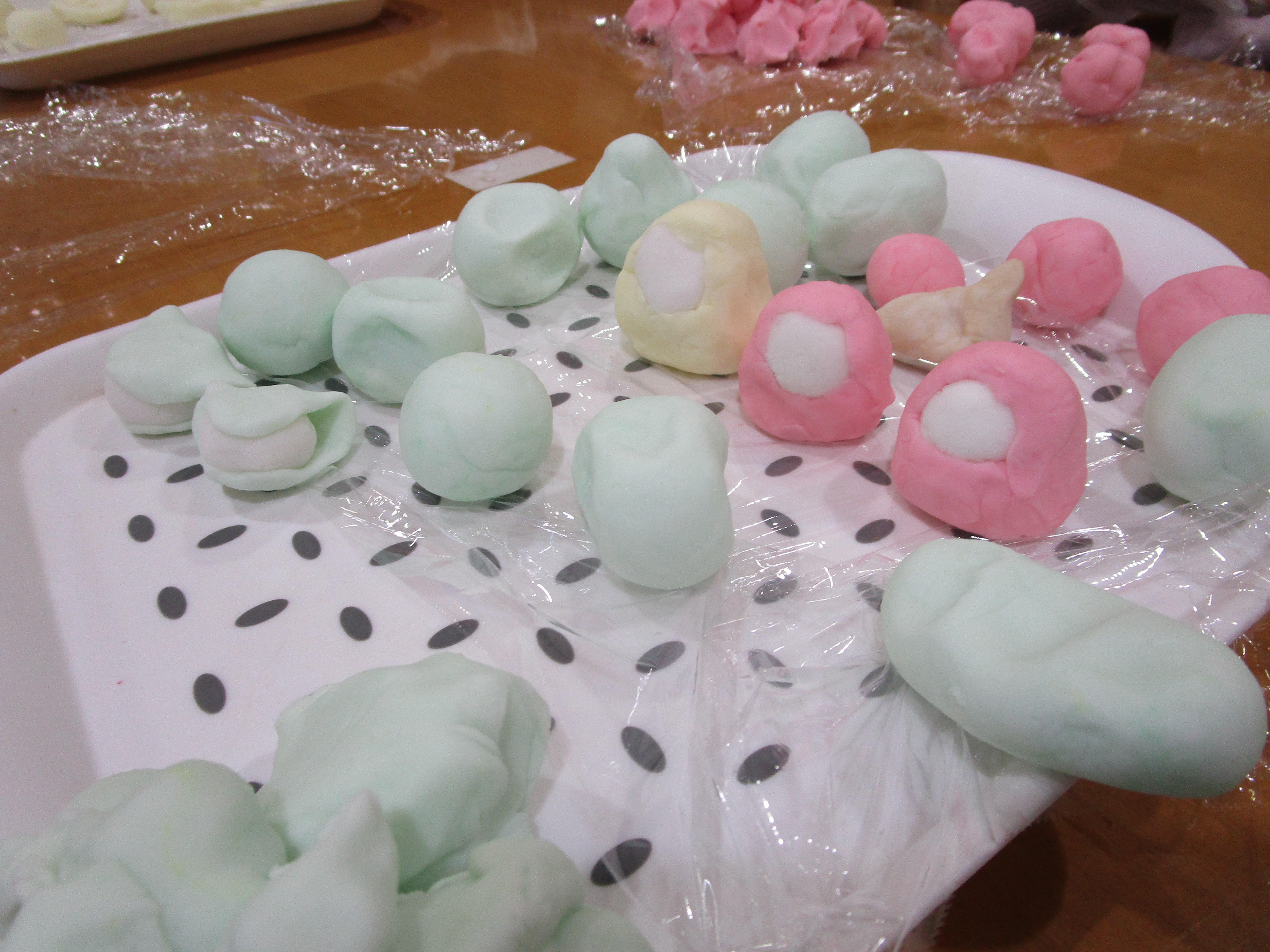 その昔、千両・万両小判、稲の花、豆、ひょうたんなどを作った記憶があるのですが。皆様面白い物を作っています。ダルマ・柏餅・ハート形と個性豊かな作品が出来ていました。