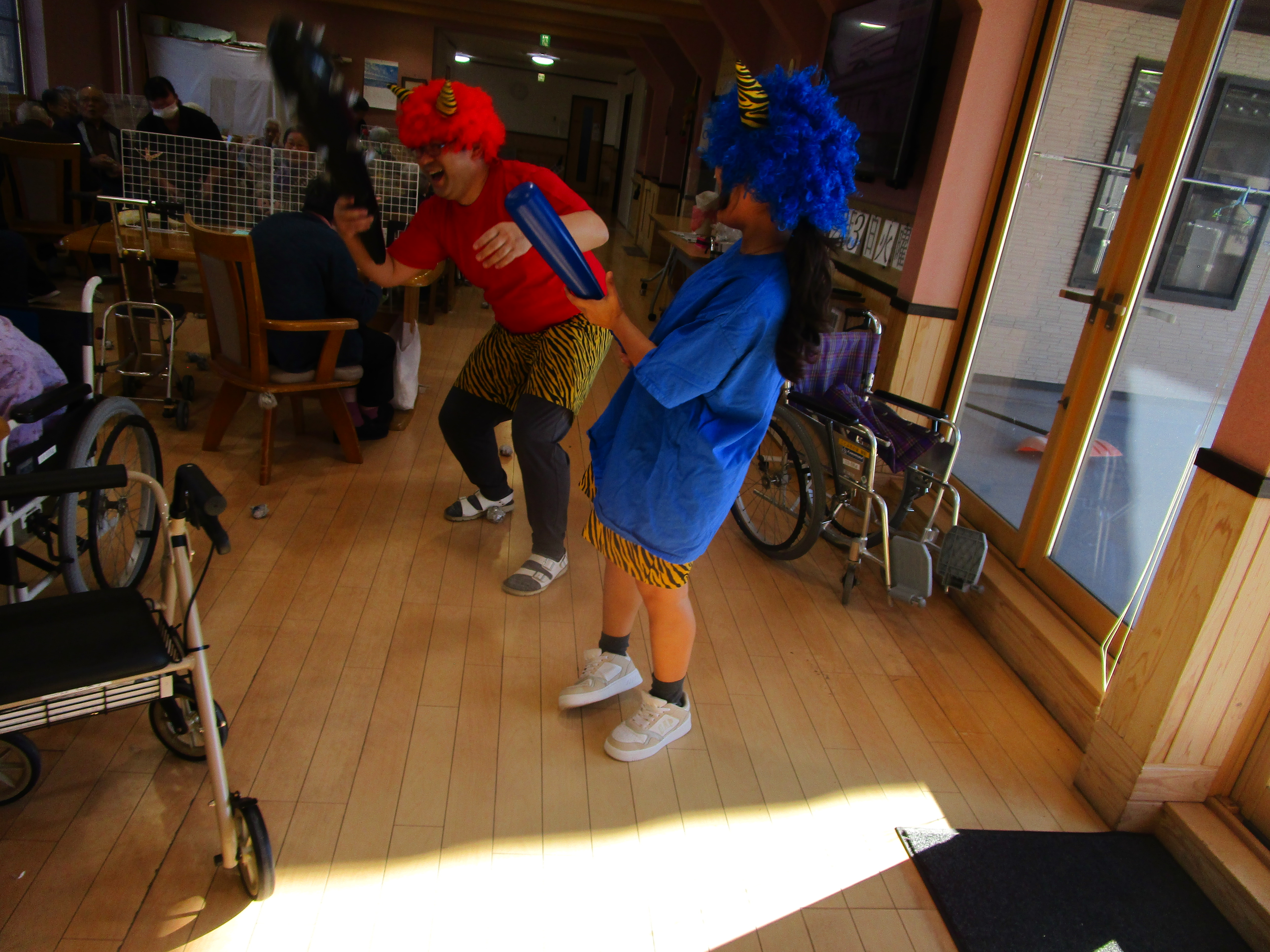 2026年2月5日 節分 ~御影~ 2月3日の午後は、節分の豆まきを行いました。 昨年同様、今年も前日の2日は、皆様新聞紙を丸めて、ボール作りをされ沢山できました (可愛い豆まきのイメージのチラシですね)登場したのは元気な赤鬼と可愛い青鬼でした 1Fフロアーは、皆様真剣に新聞紙を投げて当てています。散らかし具合もすごいですね。 これなら鬼も「参った 参った」と言って逃げていくでしょう! 散らかした分、皆さんでお片付け(*^^*) これも楽しかったです。 節分の日の昼食は、チラシ寿司でした。 立春を迎え、暦の上では、春ですね。 < 第二回 避難訓練 ~御影~